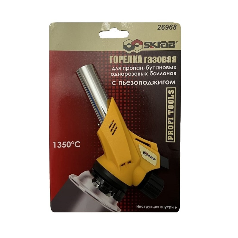 Горелка газовая на баллон с пьезоподжигом Skrab 26968 используется для плавления и сварки из легкоплавких металлов, стекла и пластмасс, удаление старой краски, для разжигая огня в неблагоприятных условиях и тд. Модель оснащена пьезоподжигом и регулировкой подачи газа.