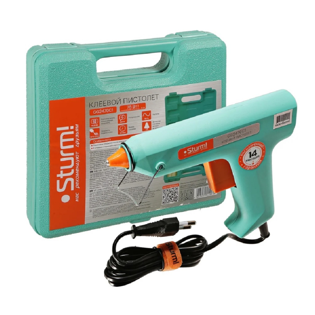 Термопистолет Sturm GG2470C1 применяется для склеивания твердых поверхностей, заполнения строительных швов и зазоров в труднодоступных местах. Подача клея осуществляется механически, путем нажатия на курок. Во время пауз и длительных перерывов между работой модель можно поставить на откидную опорную скобу. Модель поставляется в кейсе.