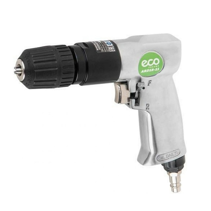 Пневмодрель ECO ARD18-11 3/8" - инструмент для сверления, зенкования, развертки и нарезания резьбы. Чаще всего их используется в строительстве, производстве и столярном деле. Она является пневматическим аналогом электродрели, но обладает преимуществом: у пневмодрели нет двигателя, что уменьшает вес инструмента и его становится проще держать в руке. Пневмодрель применяется по дереву и металлу. Максимальный диаметр сверления дерева составляет 20 мм, металла - 10 мм. Вес дрели 930 гр.