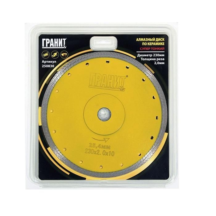 Диск алмазный Гранит СPSP 230х2.0х25.4 мм 250830 предназначен для керамики и керамогранита. Высота алмазных сегментов 10 мм., толщина реза 2 мм. Работает без охлаждения.