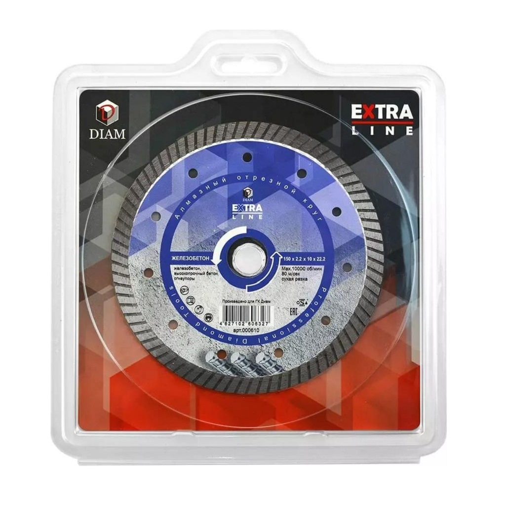 Диск алмазный DIAM EXTRA Line 150х2.2х22.2 мм, 000610 подходит для угловых шлифовальных машин, ручных резчиков и применяется для сухой резки высокоармированного бетона и мелкозернистого бетона.