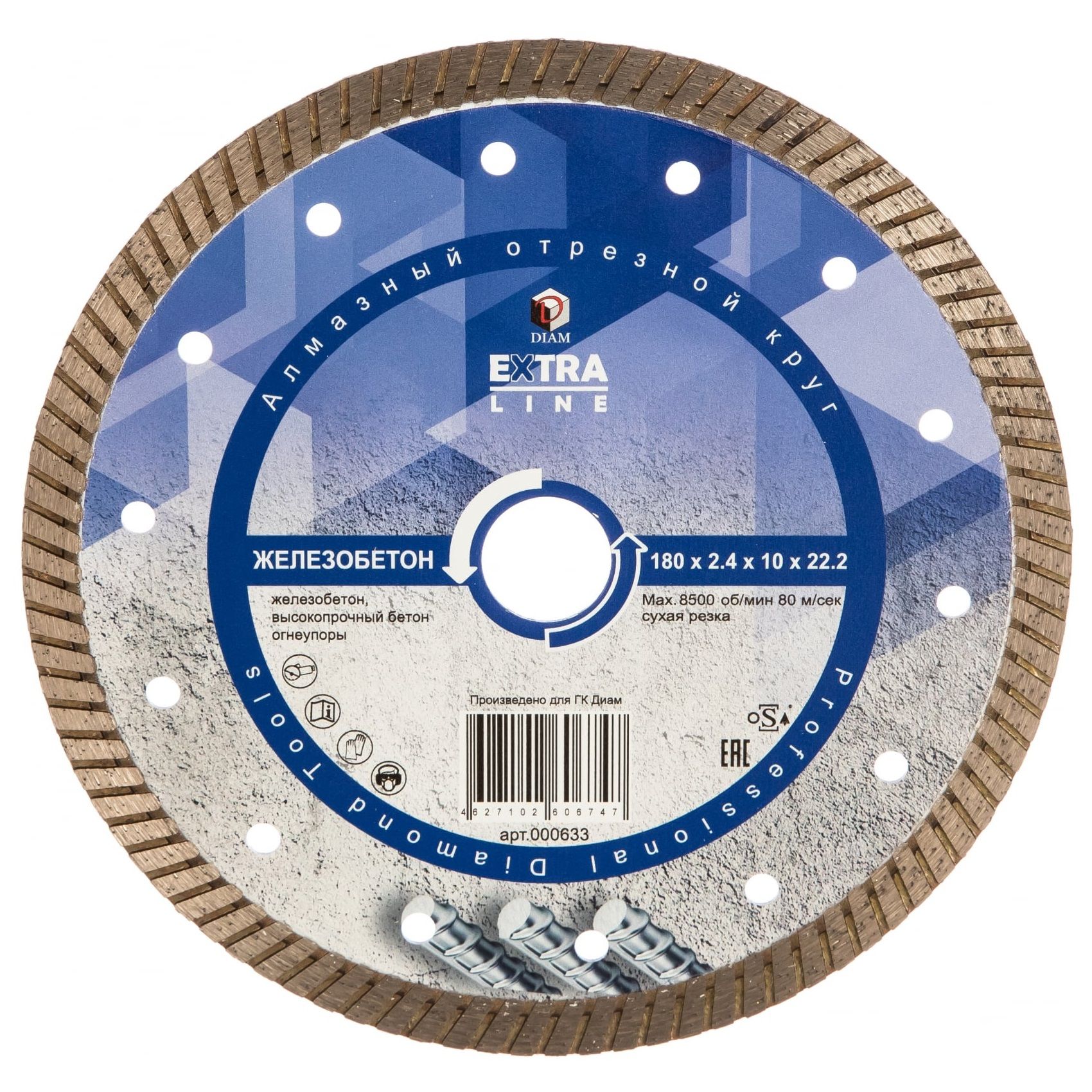Диск алмазный DIAM EXTRA Line 180х2.4х22.2 мм 000633 применяется для сухого реза высокоармированного бетона и мелкозернистого бетона.