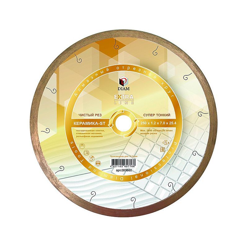 Диск алмазный DIAM EXTRA Line 250х1.2х25.4мм, 000660 используется в резке керамогранита, гранита, твердой керамической и мраморной плитки.