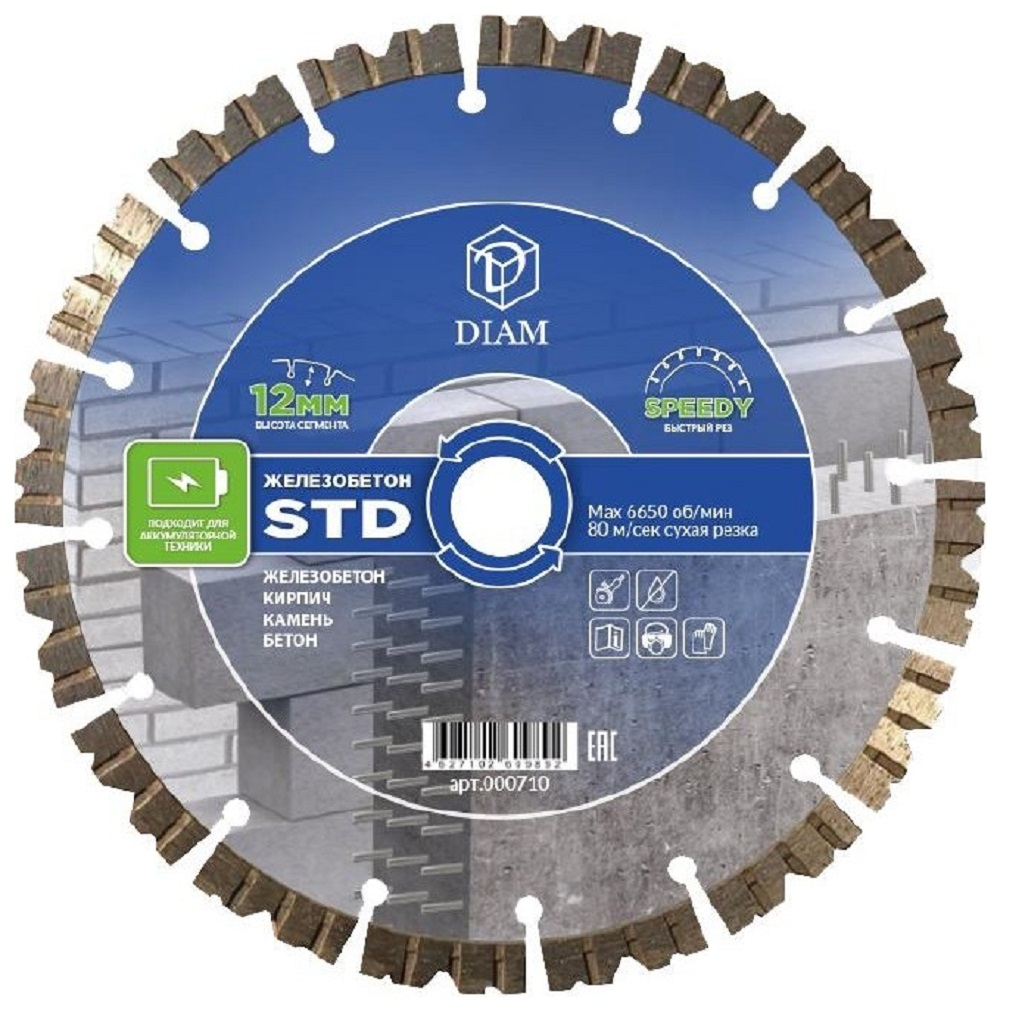 Диск алмазный DIAM STD железобетон, кирпич, камень, бетон 125х2.0х22.2 мм, 000709 предназначен для работы с деталями из бетона, камня, кирпича, железобетона. Диаметр диска составляет 125 мм, посадочный размер 22.2 мм, толщина алмазного слоя 2.0 мм. Диск алмазный DIAM STD 000710 используется на аккумуляторной технике и на ручном электроинструменте без водяного охлаждения, что особенно важно при работе в минусовую температуру воздуха. Диск применяется в сочетании с угловыми шлифовальными машинами, штроборезами и другим оборудованием. Ресурс алмазного диска DIAM STD 000709 рассчитан на 4-6 кв.м.