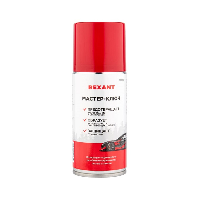 Смазка проникающая Rexant Мастер-ключ 85-0053 универсальная, аэрозоль 210 мл предназначена для облегчения отвинчивания заржавевших резьбовых соединений, смазывания трущихся поверхностей, устранения скрипов и заедания деталей, вытеснения влаги с различных деталей двигателя автомобиля, растворения различных нерастворимых в воде технических загрязнений. Устраняет заедания и скрипы, вытесняет влагу, очищает и приостанавливает процесс коррозии. Имеет специальные компоненты, которые быстро проникают внутрь ржавчины, растворяют её и возвращают подвижность резьбовым соединениям, петлям и замкам. Предотвращает заклинивание и срыв резьбы. Образует на поверхности смазывающую пленку. Аэрозольная форма выпуска и прилагаемая удлинительная трубочка позволяют использовать состав для обработки труднодоступных мест.