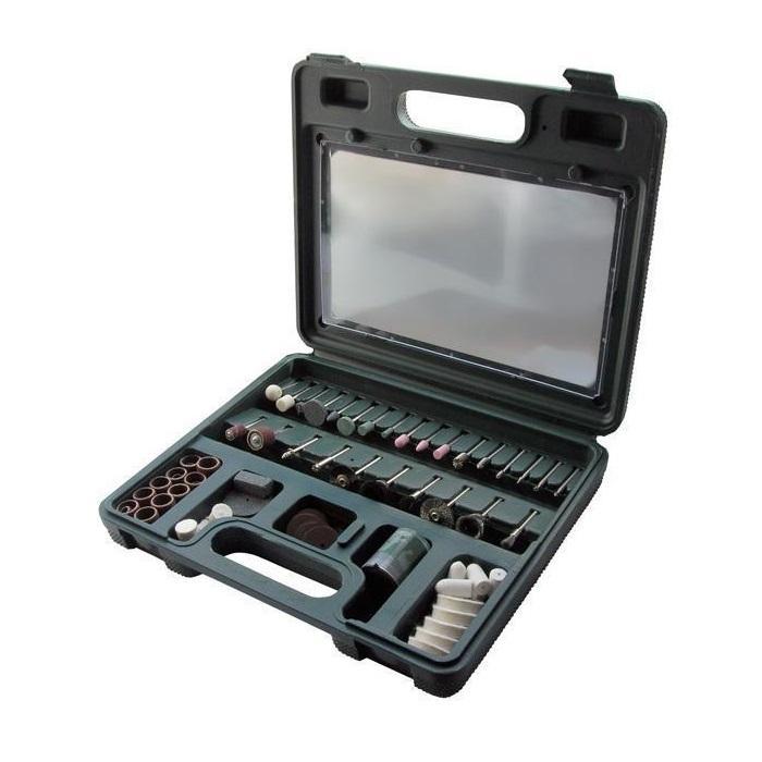 Набор FIT 36495 включает в себя 100 различных насадок и приспособлений для граверов. Полировальная насадка и различные полировальные принадлежности, шлифовальные диски и круги, шарошки, приспособления для гравировки стекла, пластика и металла, сверла, щетки.