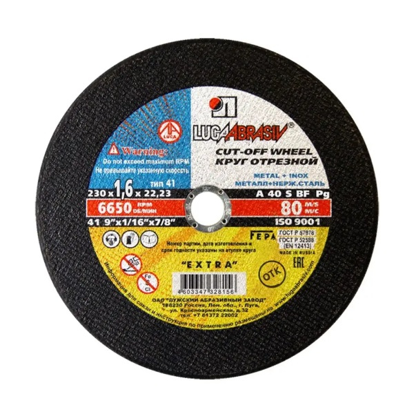 Технические характеристики круга отрезного Луга Абразив, металл, нержавеющая сталь 230х1.6х22.2 мм