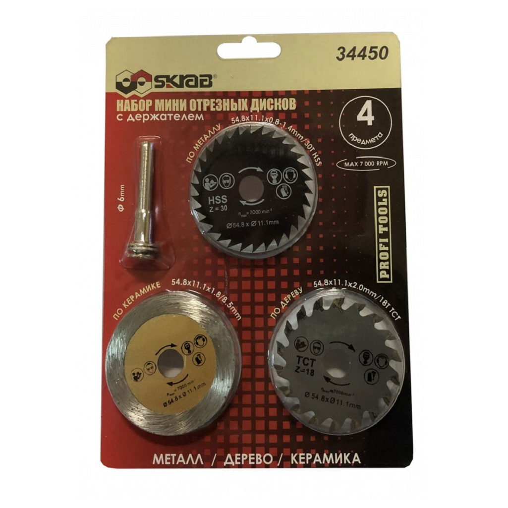 Набор мини-дисков отрезных дерево, металл, керамика SKRAB 34450 предназначен для резки металла, дерева, пластмасс, керамики в труднодоступных местах, когда использование дисков большого диаметра невозможно. Рекомендовано использовать скорость вращения мах до 7 000 об/мин.
