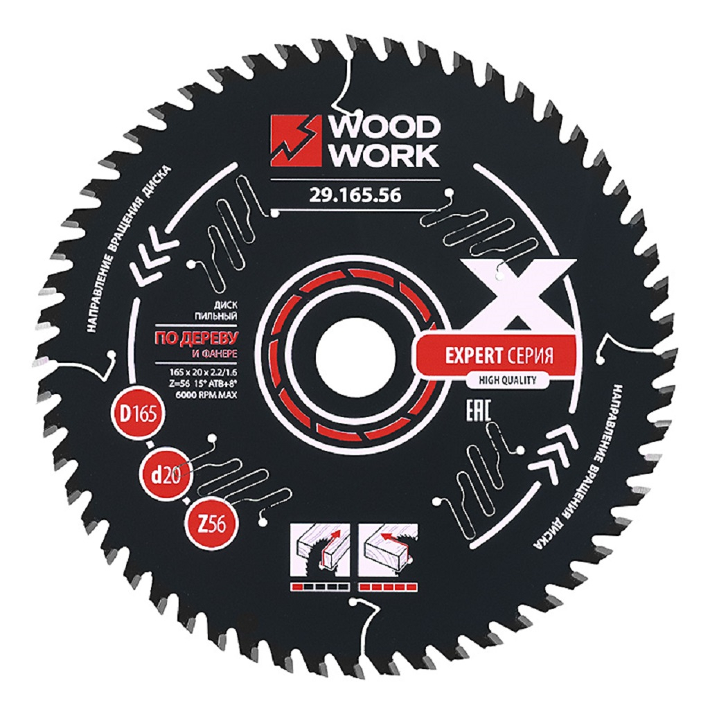 Описание диска по дереву и фанере Woodwork Expert 165х20хZ56, 29.165.56, d 165 мм, 56 зубьев