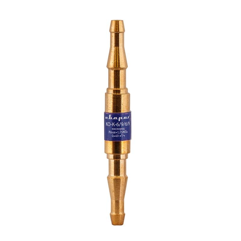 Клапан обратный- устройство предотвращения обратного потока газа в рукава. Работает по принципу перепада давления. При равном или превышающим входное давление газа происходит перекрытие тракта в обратном направлении. Обеспечивает безопасную работу с газовым инструментом.