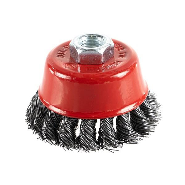 Щетка для работы с угловыми шлифовальными машинами (болгарками), в форме чашки. Рабочая поверхность выполнена из крученой стальной проволоки диаметром 0,5 мм. Диаметр щетки составляет 75 мм. Форма чашки обеспечивает хорошую площадь прилегания к поверхности и предназначена для обработки больших поверхностей.
