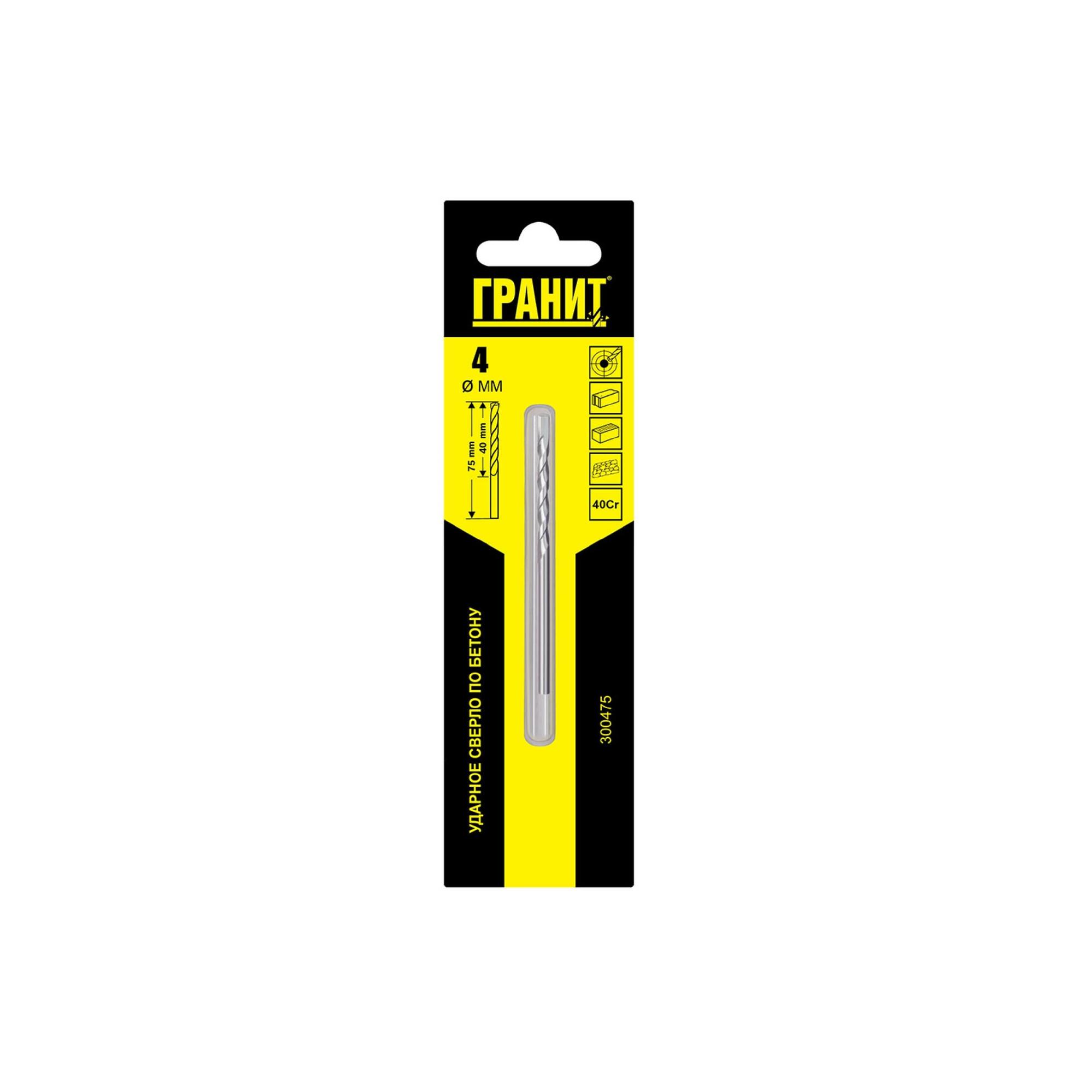 Сверло по бетону Гранит 4х75мм предназначено для ударных дрелей. Применяется для выполнения сквозных и глухих отверстий в бетоне и кирпиче. Наконечник сверла оснащен твердосплавной вставкой.