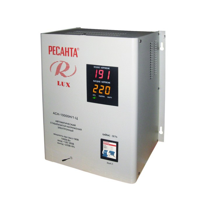 Однофазный стабилизатор напряжения Ресанта АСН 10000 Н/1-Ц Lux применяется для эффективной защиты электроприборов, мощностью до 10 кВт, от перепадов напряжения и короткого замыкания.