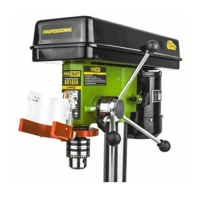 Сверлильный станок Procraft BD1850 представляет собой оборудование, при помощи которого осуществляется сверления, расточка, развертка отверстий в металлических, деревянных и других твердых поверхностях. Сверлильный станок позволяет задавать необходимую глубину сверления, корректировать скорость вращения, выполнять смену угла наклона рабочей поверхности. Такой станок позволит выполнять сверление с максимальной точностью, что станет залогом качественной работы.Устройство оснащено креплением для верстака, возможностью поворота рабочего стола вокруг своей оси. Станок имеет 5 режимов скорости, обладает мощным электрическим двигателем и двойной электроизоляцией.