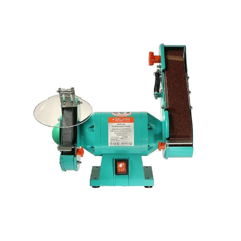 Sturm! BG61150 - комбинированное устройство для грубой и окончательной шлифовки металлических, пластмассовых и прочих предметов с использованием шлифовального диска и шлифовальной ленты.