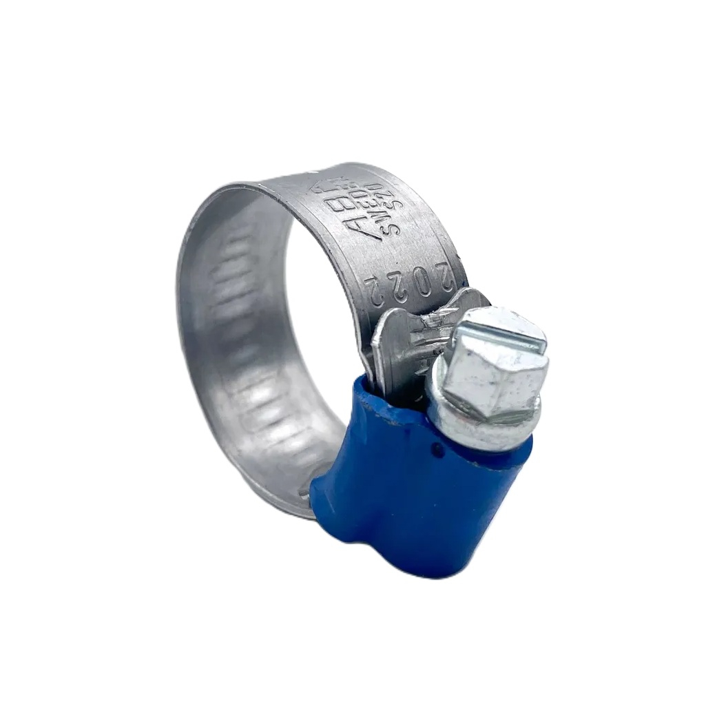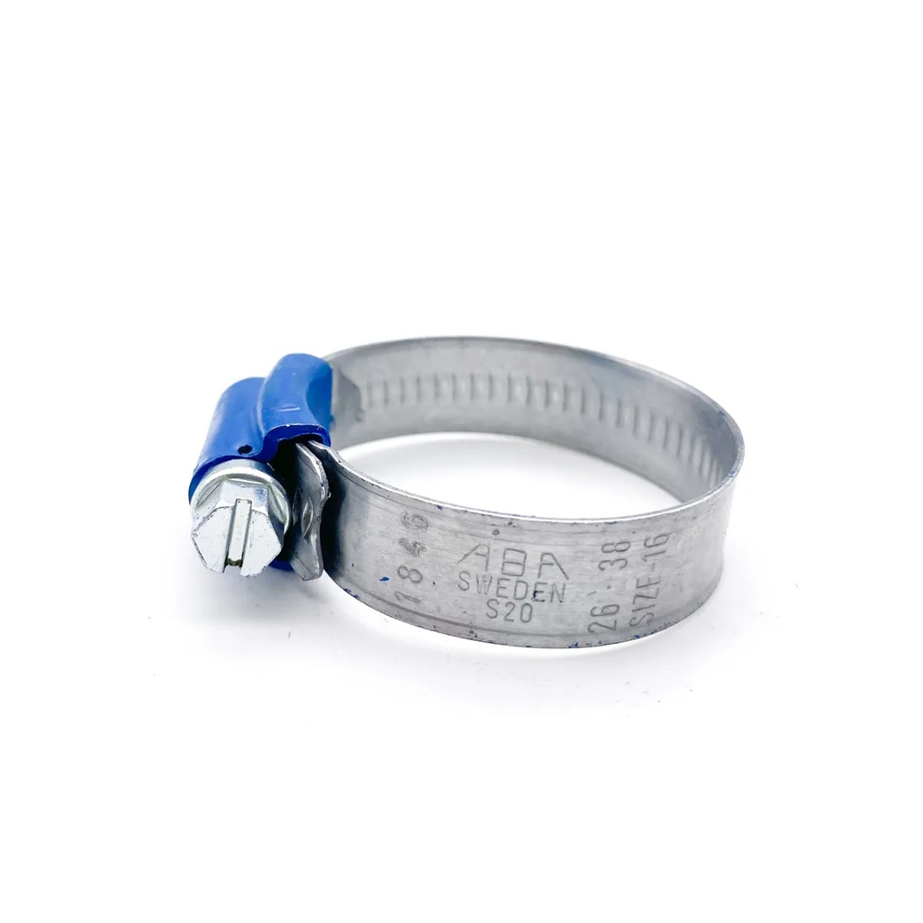 Хомут червячный обжимной ABA 26-38 12 мм, стальной снабжен лентой штампованной с одной стороны, другая сторона ленты прилегающая к патрубку имеет гладкую поверхность не травмирующую шланг. В настоящее время выпускаются хомуты второго поколения, они имеют конструкцию корпуса, обеспечивающую более равномерное распределение усилия зажима и более безопасное наложение ленты. Короткая накладка в корпусе обеспечивает оптимальное контактное давление на патрубок.