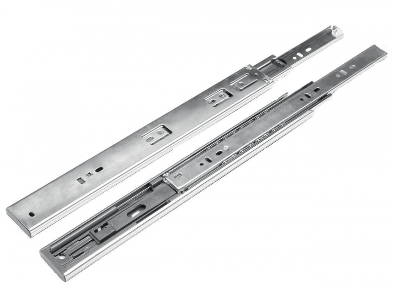 Шариковая направляющая полного выдвижения предназначена для комплектации отсеков мебели. Телескопический механизм позволяет выдвигать ящик на всю длину, но не допускает его опрокидывания.