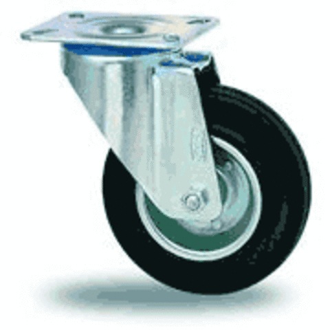 Колесные опоры серии С-SLS с платформенным креплением. Шинка - полуэластичная черная резина, обод из листовой стали с двух сторон закрыт защитными колпачками. В оси колеса роликовый подшипник. Диаметр промышл. колеса опоры поворотной (D) – 100 мм