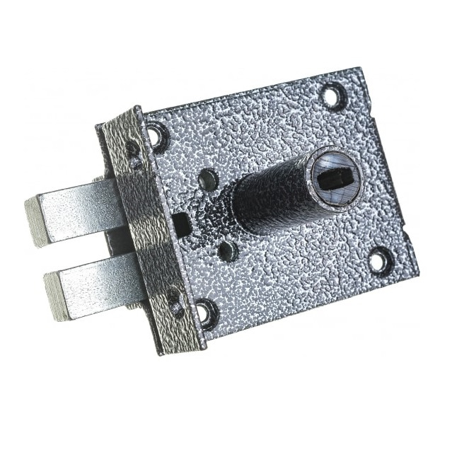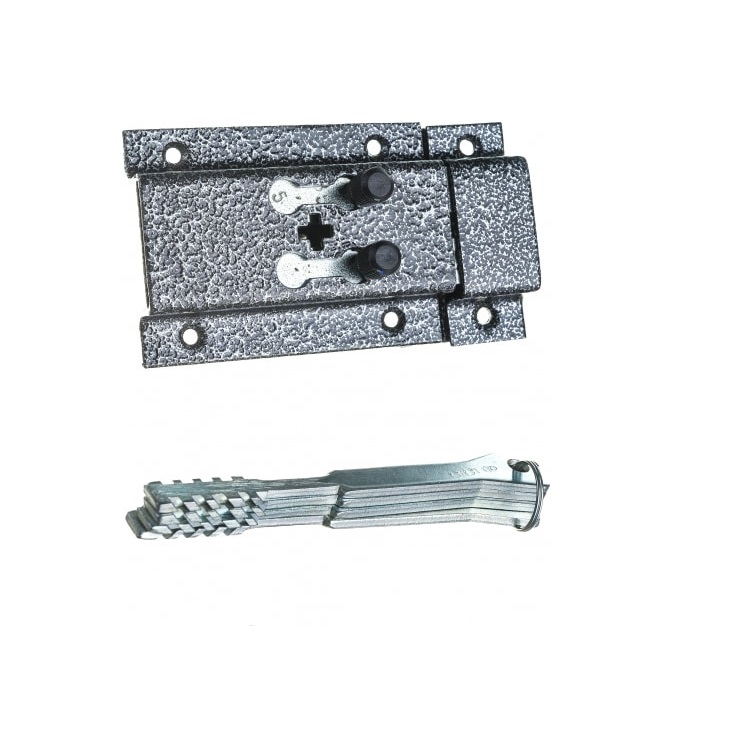 Накладной замок "Делга" КОМАЗ-ОХК с двумя прямоугольными ригелями. Тип механизма секретности - реечный. Способ открытия/ закрытия изнутри - ручкой. Удаление ключевого отверстия - 42мм