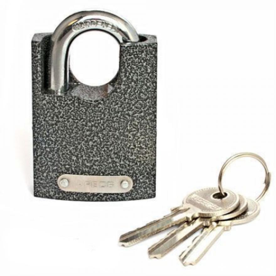 Замок навесной, шириной 40 мм, высотой 62 мм и закаленной дужкой диаметром 6 мм, предназначен для запирания дверей жилых и подсобных помещений. Сделан из чугуна, имеет автоматическое запирание, комплектуется тремя английскими ключами.