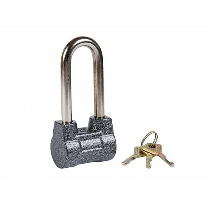 Замок навесной, материал - силумин или аналогичные сплавы, диаметр душки - 10 мм. Ключ дисковый. Удленённая душка.
