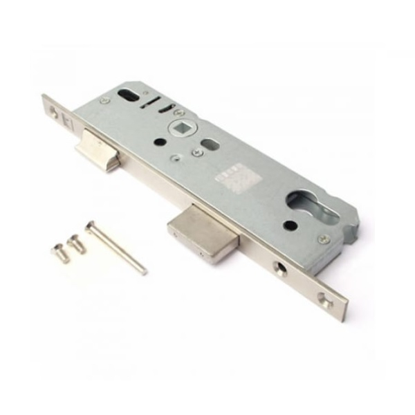 Врезной узкопрофильный замок "Apecs" 7000-40-NI для дверей из ПВХ профиля. Межосевое расстояние - 92мм, удаление ключевого отверстия от планки - 40мм, ширина планки - 16мм. Цвет: никель.