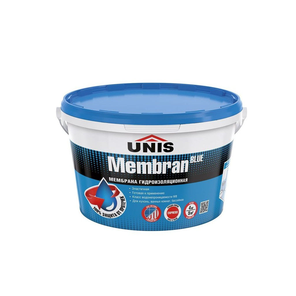 Мембрана гидроизоляционная UNIS 4кг готовая к применению бесшовная гидроизоляция для защиты строительных конструкций от неблагоприятного воздействия воды и водяных паров. Применяется внутри влажных помещений, подвергающихся периодическому воздействию воды: душевые, ванные комнаты, санузлы, кухни, прачечные, подвалы и другие влажные помещения. Особо рекомендуется для обработки гипсовых оснований во влажных помещениях. Гидроизолированную поверхность рекомендуется облицевать плиткой.