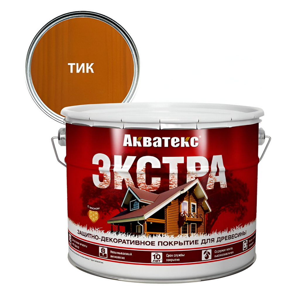 Защитно-декоративное покрытие Акватекс Экстра для древесины, полуглянцевое тик, 9л – это высокоэффективное защитно-декоративное покрытие для древесины, обеспечивающее надежную защиту от биопоражений, таких как гниение, плесень и грибок. Содержит невымываемый антисептик, представляющий собой комбинацию фунгицидов, что останавливает развитие уже начавшегося биопоражения.