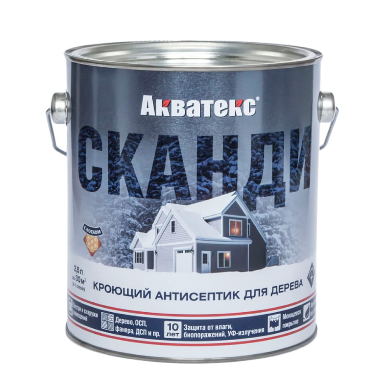 Кроющий антисептик для дерева Акватекс СКАНДИ предназначен для декоративной обработки древесины с целью получения плотного кроющего покрытия, скрывающего рисунок, но сохраняющего видимой структуру древесины; защиты древесины от воздействия влаги, появления и распространения биопоражений (гниения, плесени, грибка, синевы), УФ-излучения (потемнения, выгорания) и других атмосферных воздействий; обновления деревянных поверхностей, ранее окрашенных алкидными или акриловыми составами, в том числе темных тонов.