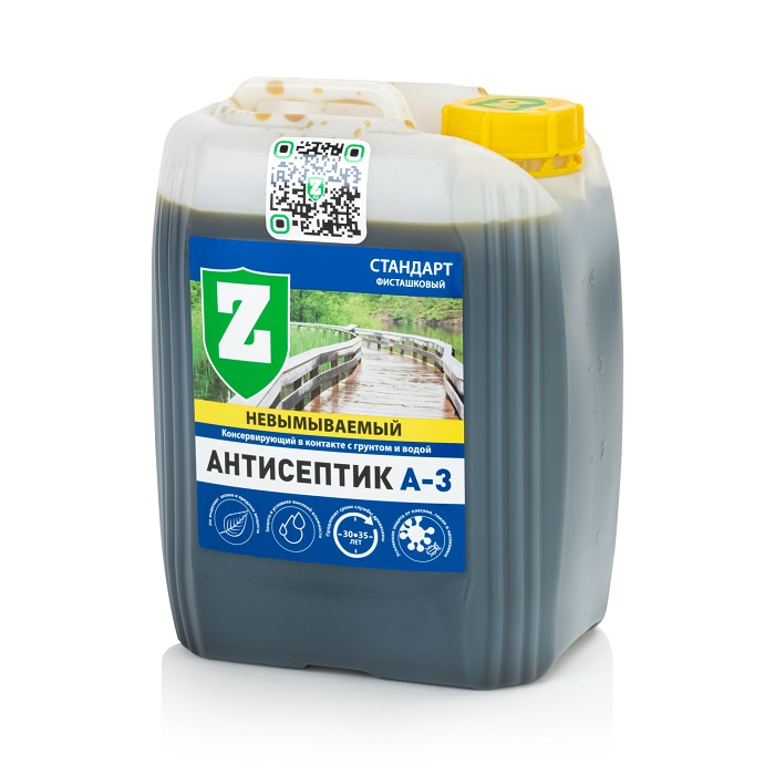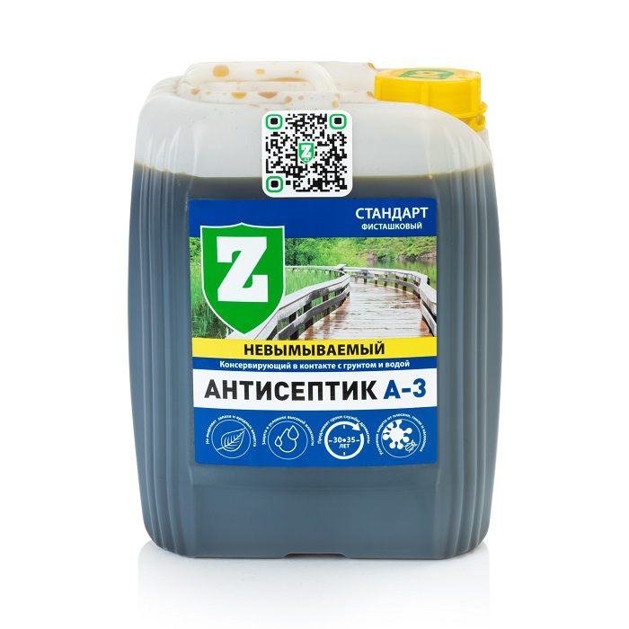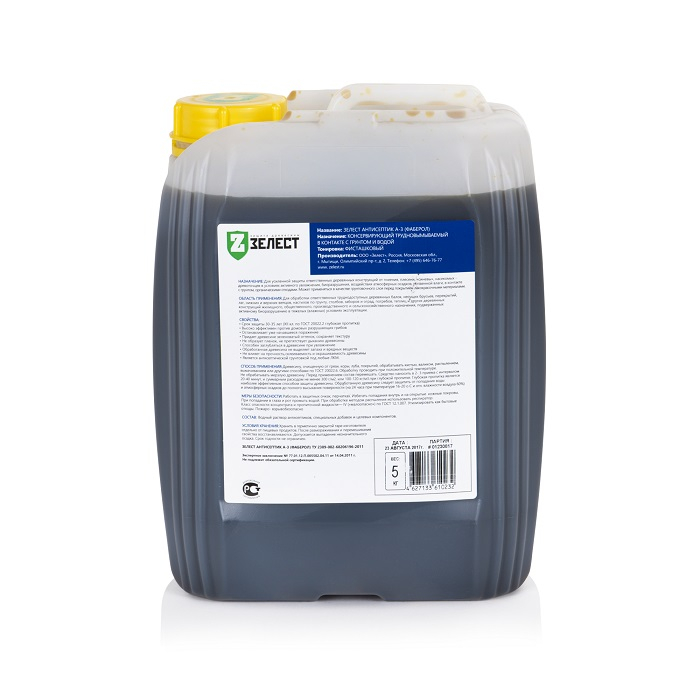 Антисептик ЗЕЛЕСТ А-3 фисташковый 10 кг предназначен для усиленной защиты ответственных деревянных конструкций от гниения, плесени, «синевы», насекомых-древоточцев в условиях активного увлажнения, биоразрушения, воздействия атмосферных осадков, почвенной влаги, в контакте с грунтом, органическими отходами. Может применяться в качестве грунтовочного слоя перед покрытием лакокрасочными материалами. Применяется для обработки ответственных труднодоступных деревянных балок, несущих брусьев, перекрытий, лаг, нижних и верхних венцов, настилов по грунту, столбов, заборов и оград, погребов, теплиц и других деревянных конструкций жилищного, общественного, производственного и сельскохозяйственного назначения, подверженных активному биоразрушению в тяжелых (влажных) условиях эксплуатации.