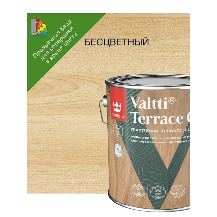 Колеруется по каталогу Tikkurila Valtti. Окончательный цвет покрытия зависит от породы и первоначального цвета древесины, а также от количества слоев. Можно использовать снаружи без дополнительной колеровки.