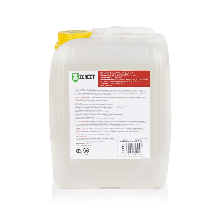 Антисептик огне-биозащита ЗЕЛЕСТ О-1-10 ОГНЕСТАНДАРТ 10 кг предназначен для защиты деревянных конструкций от воспламенения, распространения пламени, а также, гниения, плесени, синевы, насекомых- древоточцев в условиях конденсационного и гигроскопического увлажнения без контакта с грунтом и атмосферными осадками. Допускается применять средство для обработки древесины наружной эксплуатации при условии ее дальнейшего покрытия влагостойкими материалами. Может применяться в качестве грунтовочного слоя перед покрытием лакокрасочными материалами.