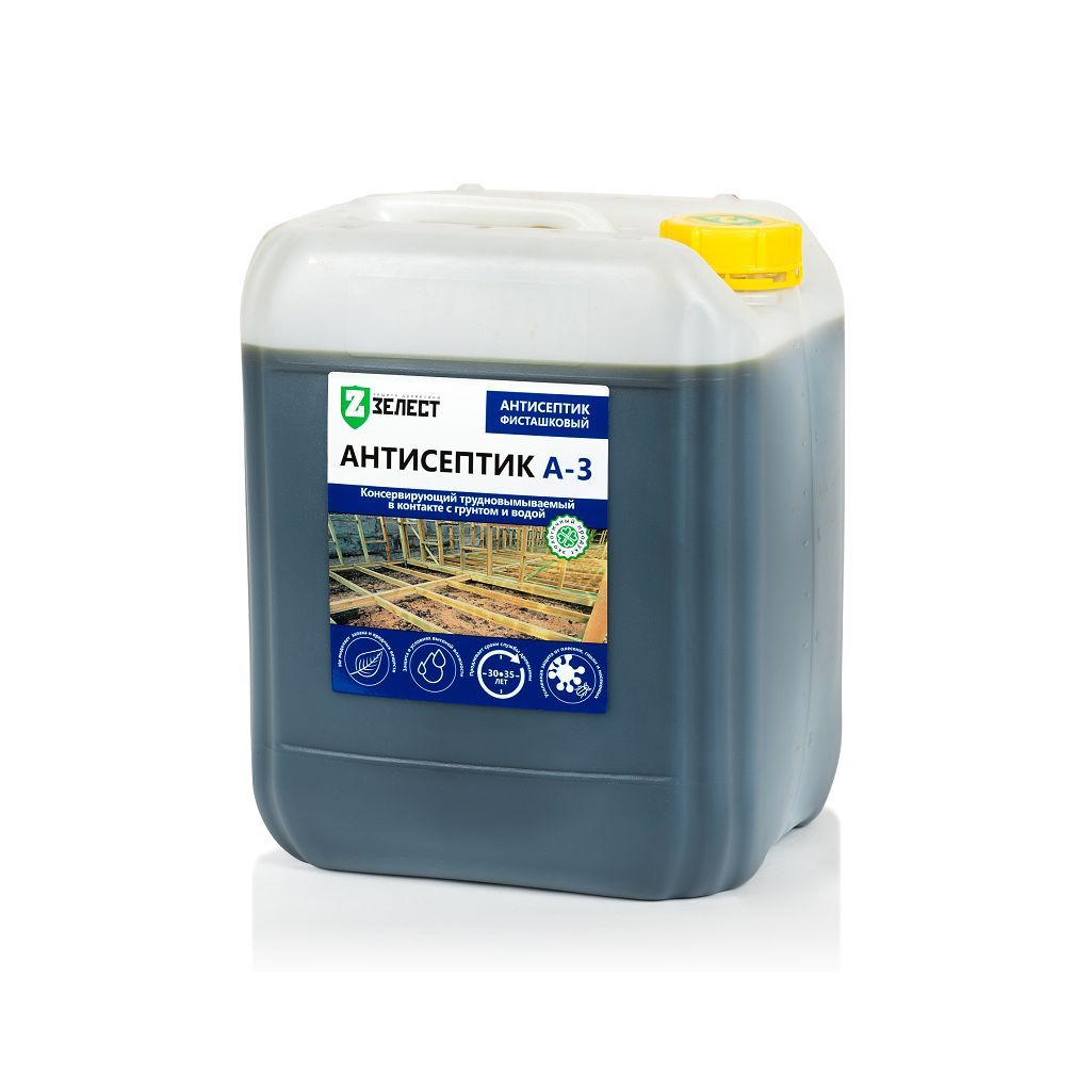 Антисептик для дерева Зелест А-3-20 20 кг - надежное средство для защиты деревянных конструкций от гниения, плесени, «синевы» и насекомых-древоточцев в условиях активного увлажнения и биоразрушения. Он эффективно защищает дерево от атмосферных осадков и почвенной влаги, что делает его идеальным для использования в контакте с грунтом и органическими отходами.