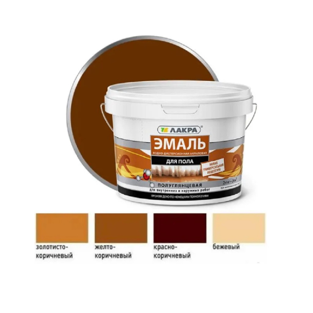Эмаль для пола Лакра 0008104 акриловая, для внутренних и наружных работ, полуглянцевая, Красно-коричневый, 2.4 кг предназначена для окрашивания деревянных и бетонных полов в жилых помещениях. Эта эмаль подходит для окрашивания дверей, мебели и других внутренних поверхностей. Состав формирует полуглянцевую поверхность, устойчивую к механическим повреждениям, влаге и износу. Эмаль для пола Лакра отличается превосходными декоративными и защитными характеристиками, быстро сохнет и выдерживает до 5 циклов замораживания. Рекомендуемая температура эксплуатации составляет от +12 °С до +20 °С. Время высыхания от пыли - 1 час, на полное высыхание требуется 8 часов.