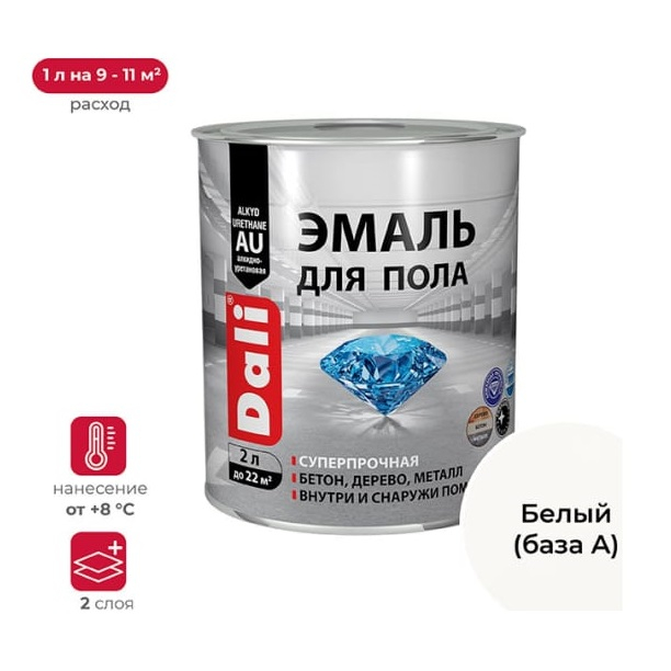 Эмаль Рогнеда DALI для пола суперпрочная, бетон, дерево, металл внутри и снаружи, белый База А 2 л - это алкидно-уретановая эмаль предназначена для защитно-декоративной обработки бетонных и деревянных полов, лестниц и прочих горизонтальных поверхностей в жилых, общественных и складских помещениях, в том числе подвергающихся умеренному механическому и химическому воздействию. Применяется снаружи и внутри помещений по новым и ранее окрашенным минеральным (бетон, цемент), деревянным и металлическим поверхностям.