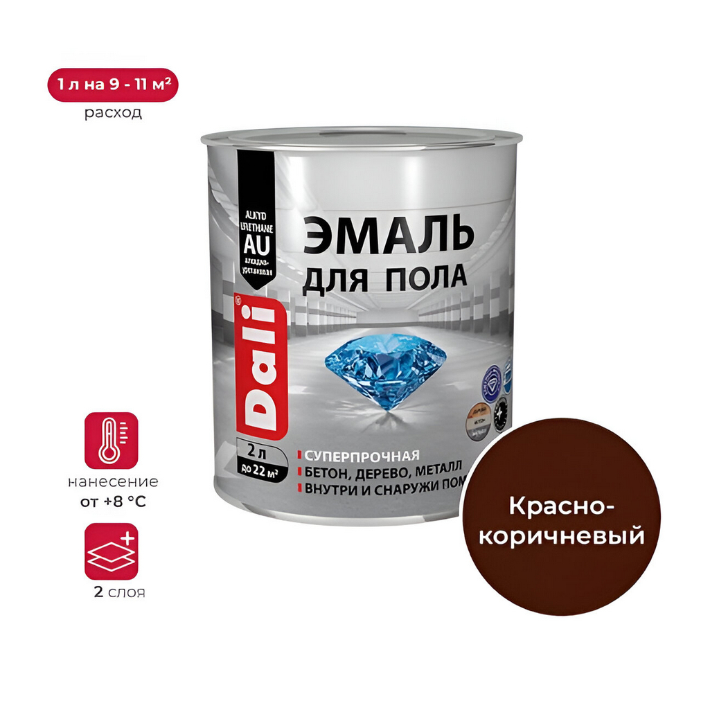 Эмаль Dali для пола, для защитно-декоративной обработки, глянцевая,, красно-коричневая, 2 л предназначена для защитно-декоративной обработки бетонных и деревянных полов, лестниц и других горизонтальных поверхностей. Эта алкидно-уретановая эмаль идеально подходит для использования как внутри, так и снаружи помещений, включая жилые, общественные и складские помещения с умеренным механическим и химическим воздействием.