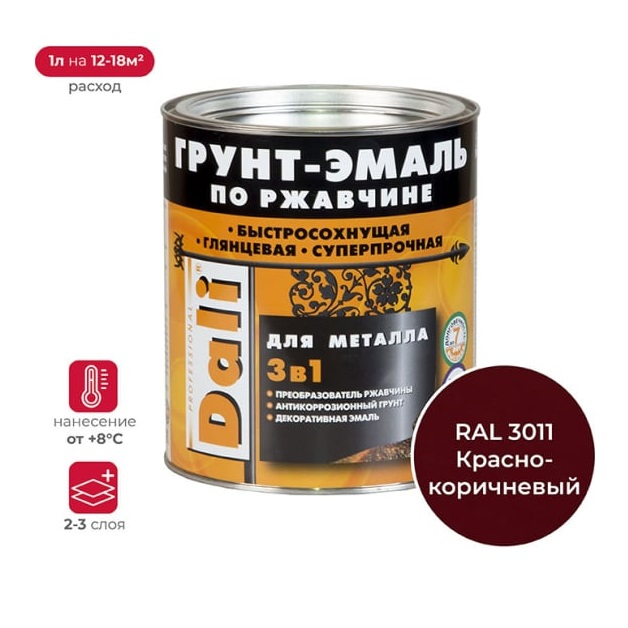 Грунт-эмаль по ржавчине Рогнеда DALI для металла 3в1 RAL 3011 красно-коричневая 2 л предназначена для защитно-декоративной обработки различных металлических поверхностей, в том числе пораженных точечной или сплошной коррозией.