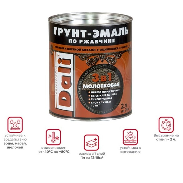 Грунт-эмаль по ржавчине Рогнеда DALI молотковая 3 в 1, серая 2 л предназначена для защитно-декоративной обработки различных металлических поверхностей, в том числе пораженных точечной или сплошной коррозией с толщиной ржавчины до 100 мкм. Применяется внутри и снаружи помещений по любым металлическим поверхностям, новым и ранее окрашенным: стальным и чугунным (решетки, ограды, гаражи, ворота и пр.); цветным металлам (цинк, медь, алюминий); поверхностям из оцинкованного металла (профнастил) и нержавеющей стали. Допускается нанесение на деревянные поверхности, влажностью не выше 20%, эксплуатируемые внутри помещений.