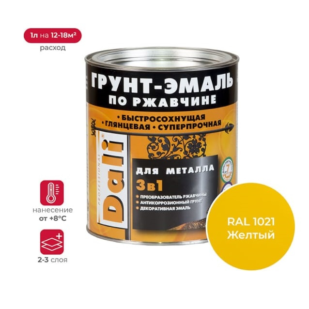Описание грунта-эмали по ржавчине Рогнеда Dali для металла 3 в 1 RAL 1021 желтая 2 л
