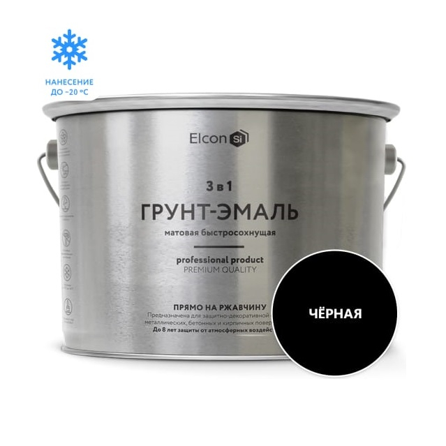 Грунт-эмаль по ржавчине Elcon 3в1 быстросохнущая матовая черная 10 кг предназначена для нанесения как на чистые, так и на пораженные ржавчиной металлические поверхности с целью создания надежной антикоррозионной защиты металлоконструкций, металлического оборудования, прочих металлических изделий.