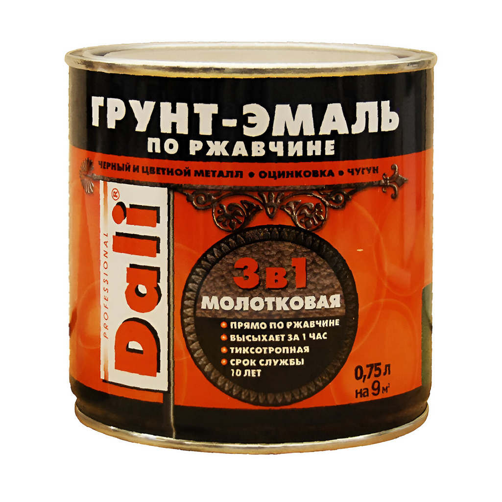 Грунт-эмаль Рогнеда Dali 3 в 1 по ржавчине молотковая, серый 0.75 л предназначена для защитно-декоративной обработки металлических поверхностей, включая те, которые поражены коррозией с толщиной ржавчины до 100 мкм. Продукт идеально подходит как для внутренних, так и для наружных работ, обеспечивая надежную защиту и долговечное покрытие.