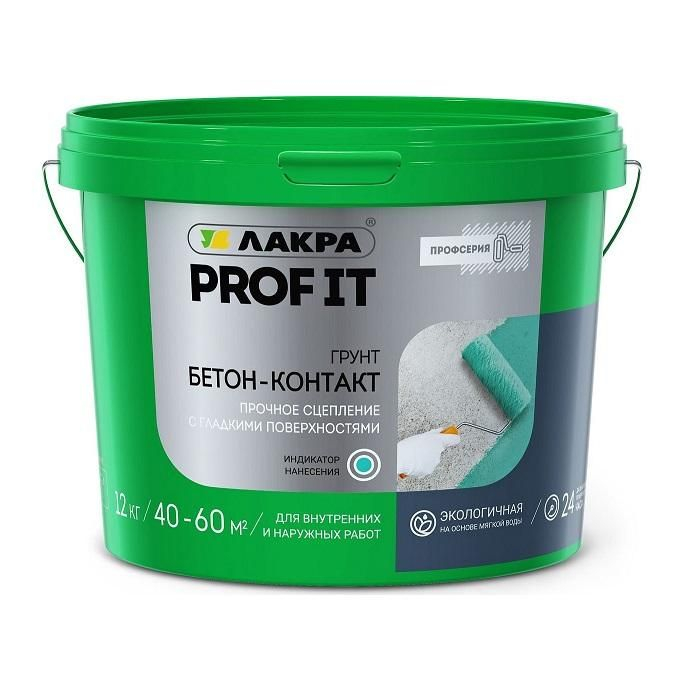 Грунт Лакра PROF IT Бетон-контакт 12 кг для предварительной обработки плотных, слабо впитывающих влагу оснований (монолитного бетона, бетонных блоков, бетонных потолков) перед нанесением гипсовых, гипсово-известковых, известково-цементных и других штукатурок. В качестве грунтовки перед оштукатуриванием старых плиточных облицовок гипсовой штукатуркой. Для предварительной обработки ГКЛ перед облицовкой керамической плиткой.