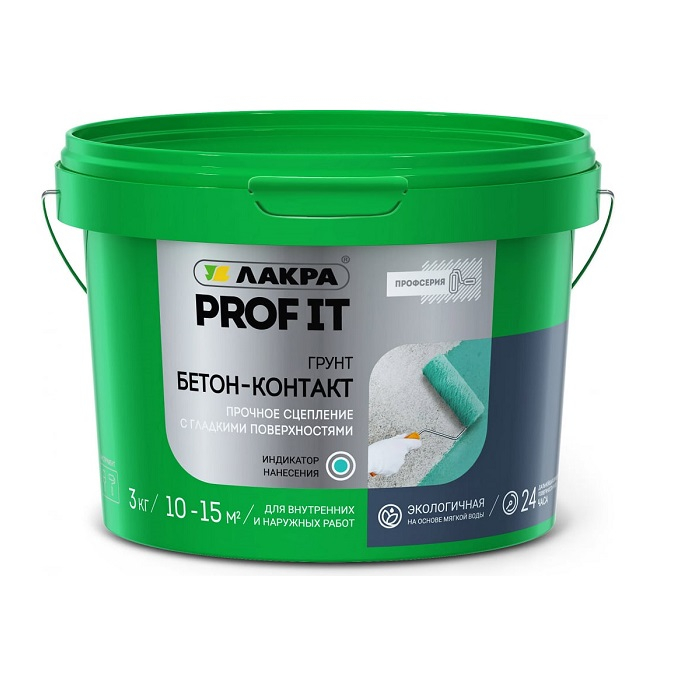 Грунт Лакра PROF IT Бетон-контакт 3 кг - это грунт бетон-контакт предназначеный для предварительной пропитки плотных и слабо впитывающих поверхностей перед нанесением гипсовых, известковых и цементных штукатурок. Средство используют при внутренней и внешней отделки помещений в качестве грунтовки. Состав повышает адгезию финишных отделочных ЛКМ к гладким бетонным основаниям. Продукт подходит для обработки ГКЛ перед облицовкой керамической плиткой.