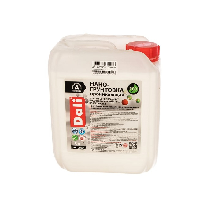 Нано-грунтовка DALI акриловая глубокопроникающая 5 л - это акриловая глубокопроникающая нано-грунтовка, которая подготавливает поверхности к последующему нанесению отделочных материалов. Продукт используют внутри и вне помещений для укрепления гладких, микропористых и слабо впитывающих оснований: гипсокартон, ДВП, кирпич, бетон, камень, цемент. Состав усиливает адгезию финишных штукатурок, шпатлевок, клеев и водно-дисперсионных ЛКМ.