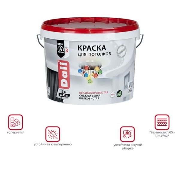 Краска DALI для потолков высокоукрывистая снежно-белая шелковистая 9 л 20249 - это акриловая краска для декоративного окрашивания потолков в жилых и общественных помещения,(бетон, кирпич, гипс, цемент, гипсокартон, шпатлевка, штукатурка и др.). Глубокоматовое покрытие визуально скрывает мелкие дефекты основания, образует глубокоматовое долговечное покрытие, устойчива к УФ-излучению; матовая; снежно-белая (коэффициент белизны 96%); не желтеет в процессе эксплуатации; без запаха; тиксотропная - не течет и не капает с инструмента во время окрашивания.