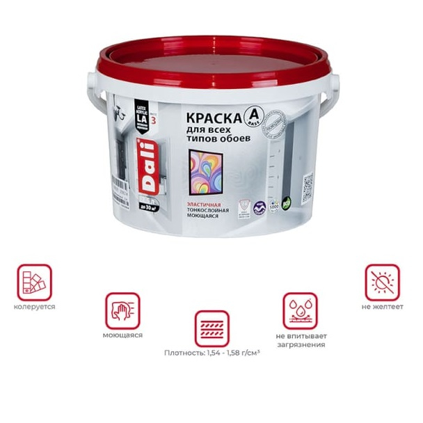 Краска Dali для всех типов обоев эластичная тонкослойная моющаяся, База А белый 2.5 л применяется для декоративного окрашивания стен в жилых или общественных помещениях с повышенной эксплуатационной нагрузкой. Является износостойкой, при высыхании образуется прочный моющийся слой. Наносится по дереву, кирпичу, бетону, гипсокартону и для обоев: виниловые, стеклотканевые, флизелиновые, водостойкие бумажные.