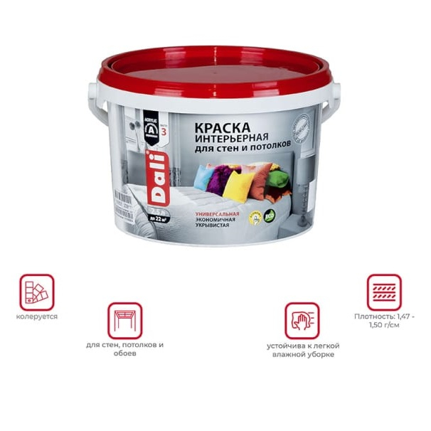 Краска DALI интерьерная для стен и потолков универсальная, База А белая 2.5 л образует влагостойкое глубокоматовое шелковистое покрытие. Моющаяся, выдерживает многократное количество циклов истираний с применением бытовой химии без образования залоснившихся участков и потери толщины покрытия. Обладает пониженным грязеудержанием: не впитывает загрязнения, легко отмывается от любых бытовых пятен. Легко наносится, равномерно распределяется по поверхности, не разбрызгивается, не образует разводов и подтеков, не оставляет следов и не капает с малярного инструмента. Отличается высокой укрывистостью и низким расходом, образует паропроницаемое («дышащее») покрытие. Не желтеет и не теряет цвет в процессе эксплуатации, не мелит, не имеет неприятного запаха.