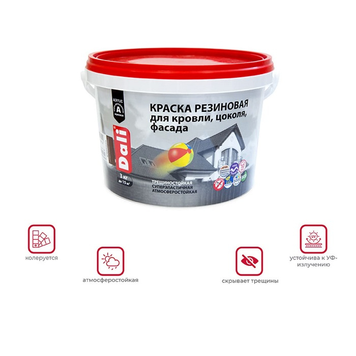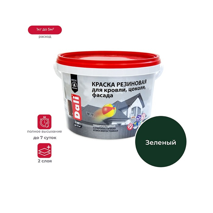 Краска резиновая Рогнеда DALI для кровли, цоколя, фасада зеленая 3 кг предназначена для защитно-декоративного окрашивания крыш, фасадов, цоколя зданий и сооружений, требующих долговременной эксплуатации и подверженных образованию трещин, а также декоративного окрашивания стен и потолков в жилых и общественных помещениях с повышенной влажностью воздуха или неотапливаемых.