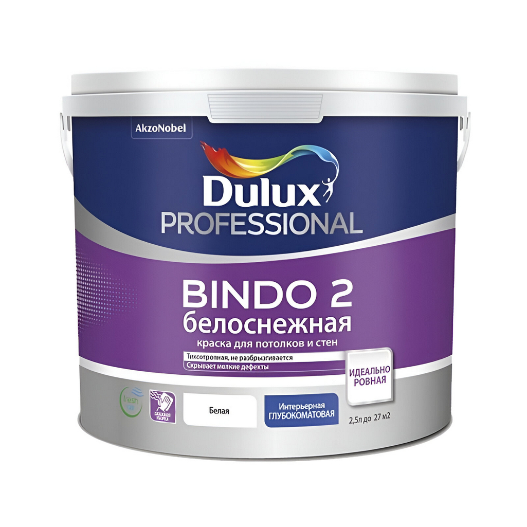 Описание краски Dulux Bindo 2 для стен и потолков, матовой, белоснежной, 2.5 л