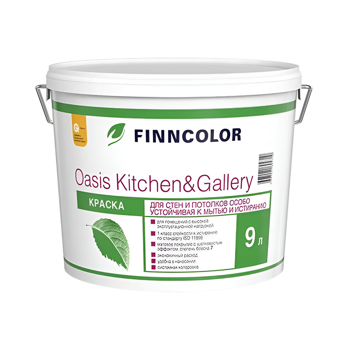 Краска Finncolor Oasis Kitchen & Gallery для стен и потолков особо устойчивая к мытью, База А белый 9 л матовая с шелковистым эффектом, особо устойчивая к мытью водно-дисперсионная краска OASIS KITCHEN&GALLERY предназначена для окрашивания стен и потолков в сухих и влажных помещениях (кроме ванных комнат), а также в помещениях с высокой эксплуатационной нагрузкой (кухни, столовые, вестибюли, коридоры, помещения общественного и коммерческого назначения), требующих частой уборки, по бетонным, кирпичным, оштукатуренным, зашпатлеванным поверхностям, гипсокартону, структурно-волокнистым и стеклообоям, древесно-стружечным и древесно-волокнистым плитам.